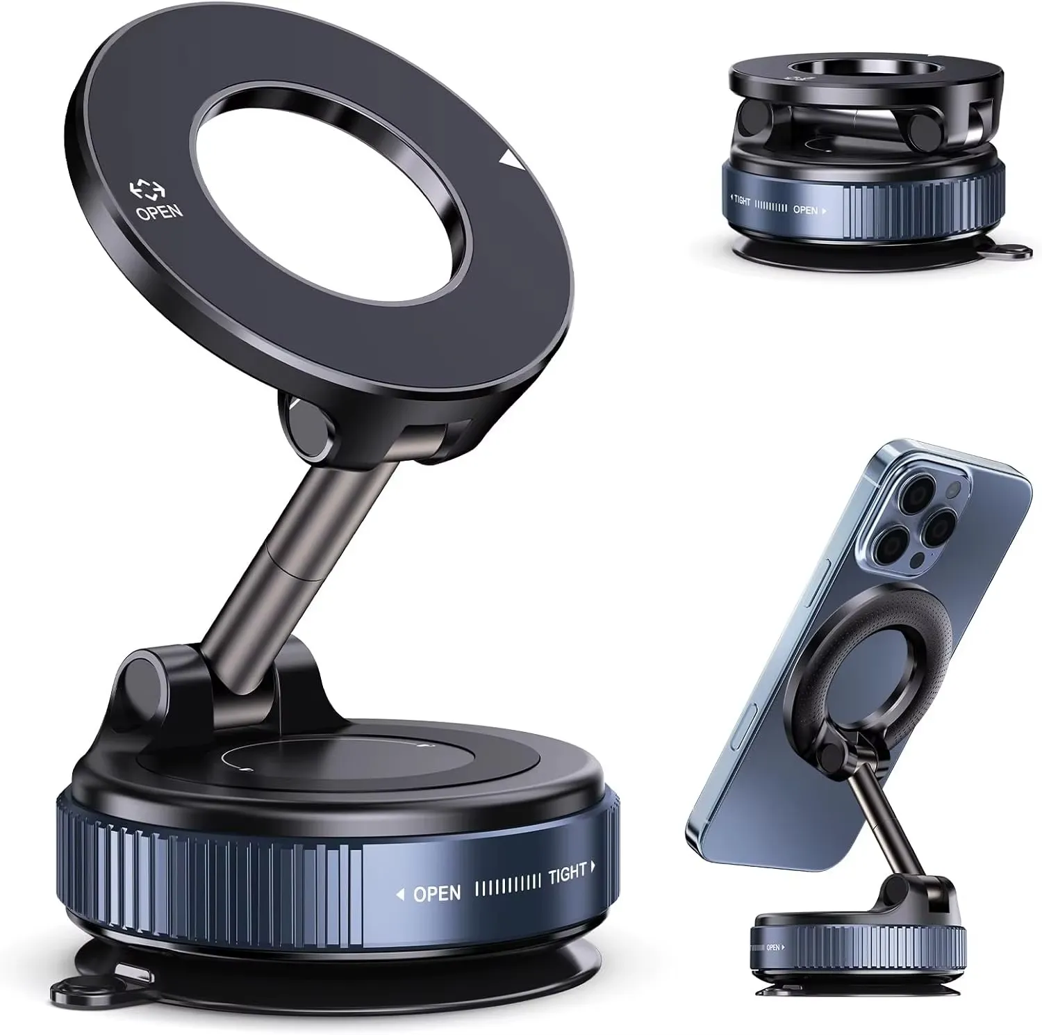 حامل موبايل فاكيوم مغناطيسي بقوة تثبيت عالية. يركب على أي سطح بسهولة، مناسب للسيارة والمكتب، ويمسك الموبايل بثبات من غير ما يقع.